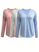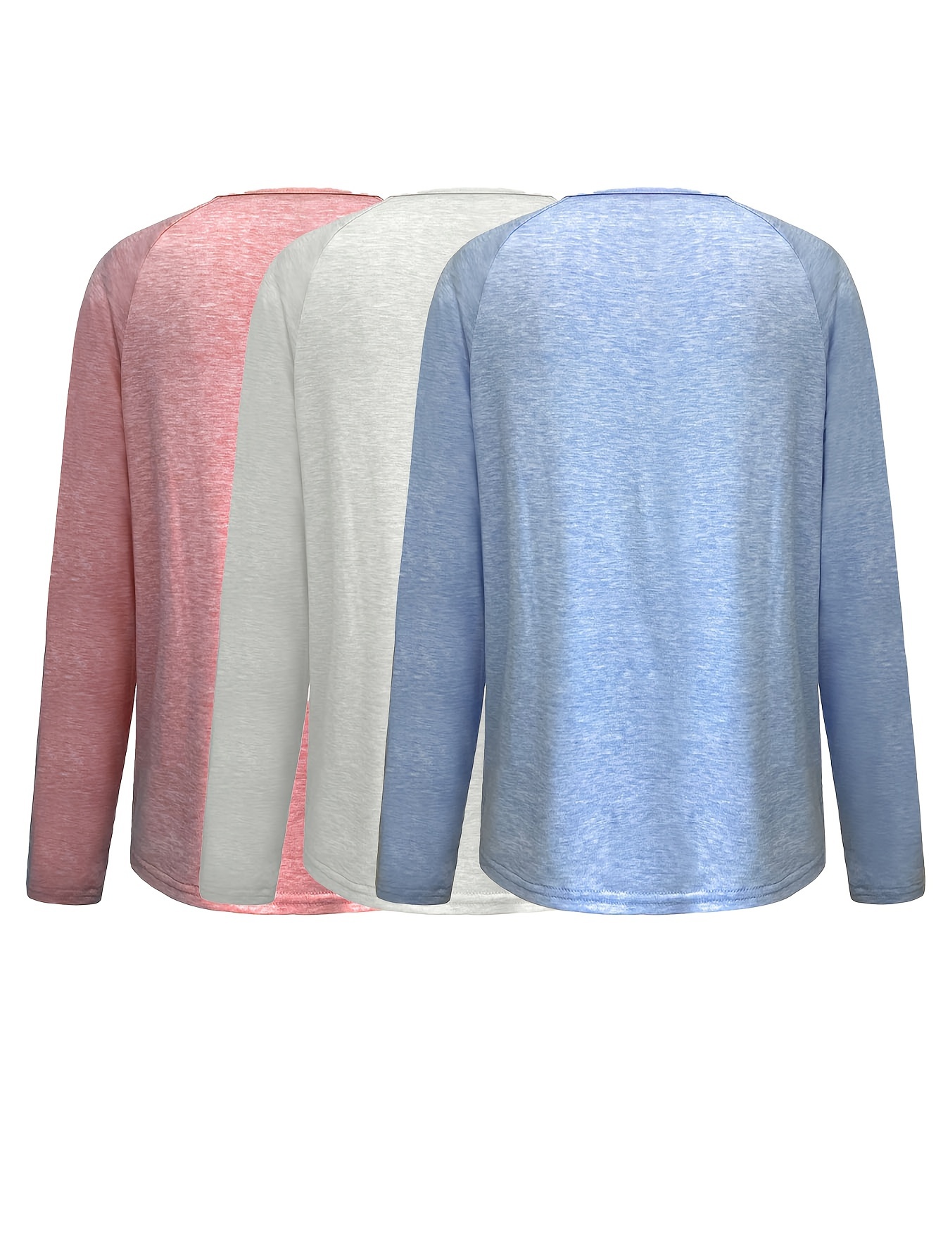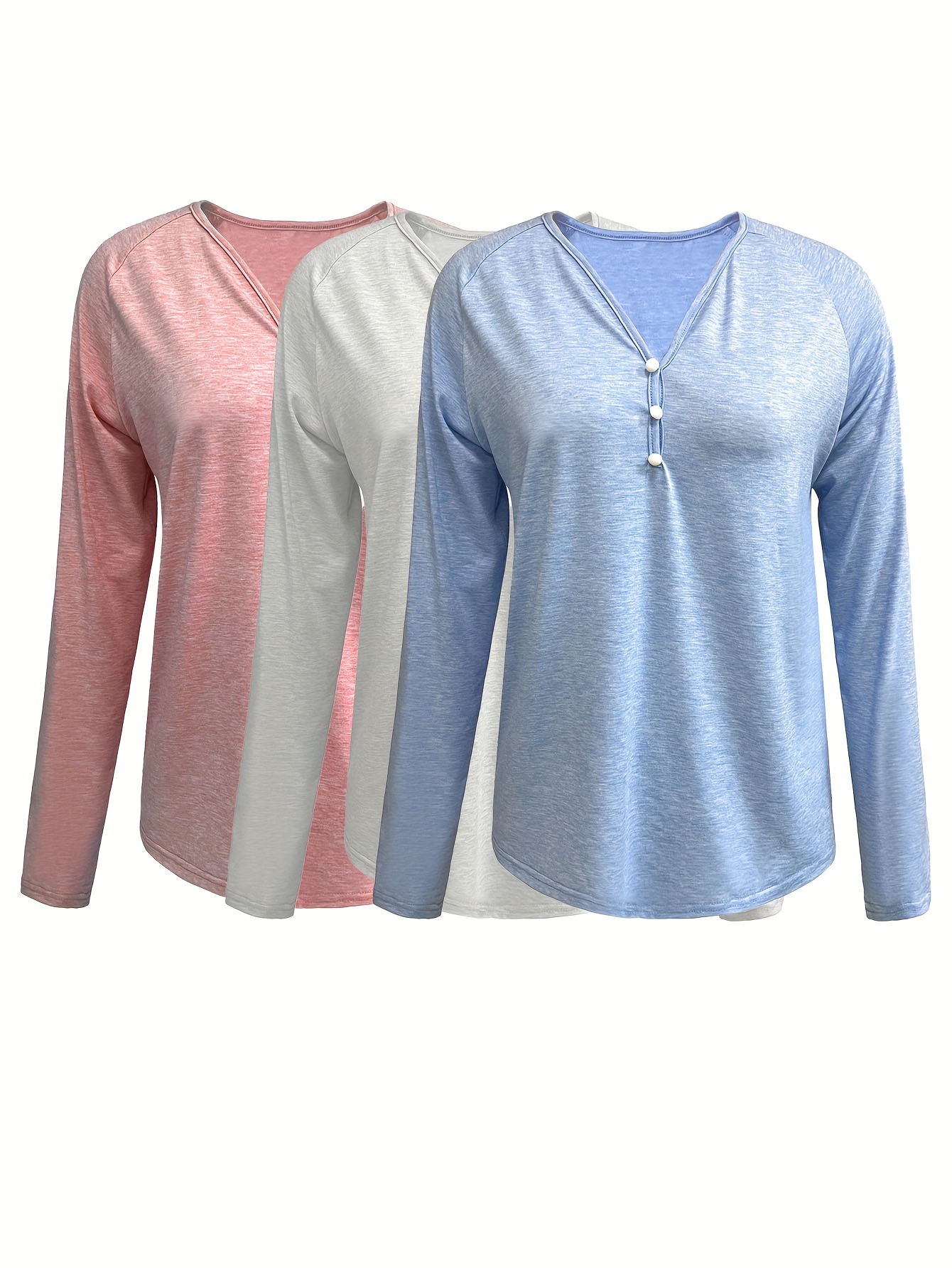 Home Women's T-Shirt 3-Pack Elegant Women’S Long Sleeve Pullover Tops with Buttons – Polyester 95%, Spandex 5% Knit Fabric, V-Neck Solid Color, Regular Length, All-Season Casual Wear
