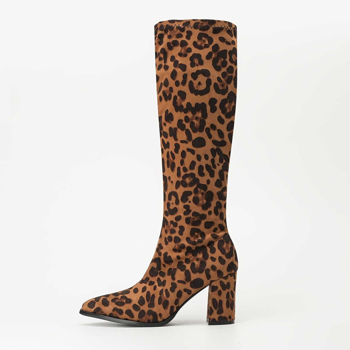 Chic Plus-Size Leopard Print Women’s Knee-High Boots – Sexy Pointed Toe with High Block Heel, Stretchy Slimming Effect, Easy Slip-On, Faux Cover Lining for Comfortable Dress Wear, High Heel Boots