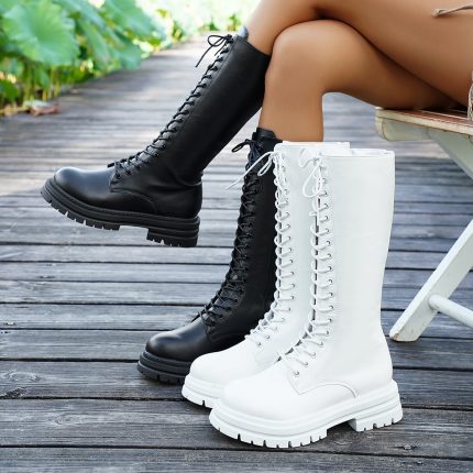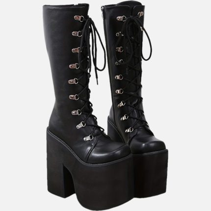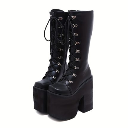Women’s Y2K Side Zipper Platform Boots, Black Closed Toe Lace Up Long Boots, Women’s Fashion Shoes